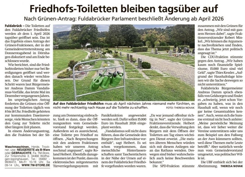 Die Fuldabrücker Grünen haben im September den (Änderungs-)Antrag bei der Gemeindevertretersitzung eingebracht, dass die Toiletten auch außerhalb von Trauerfeiern für die Öffentlichkeit zugänglich gemacht werden solllen. (22.09.2025/DJ)